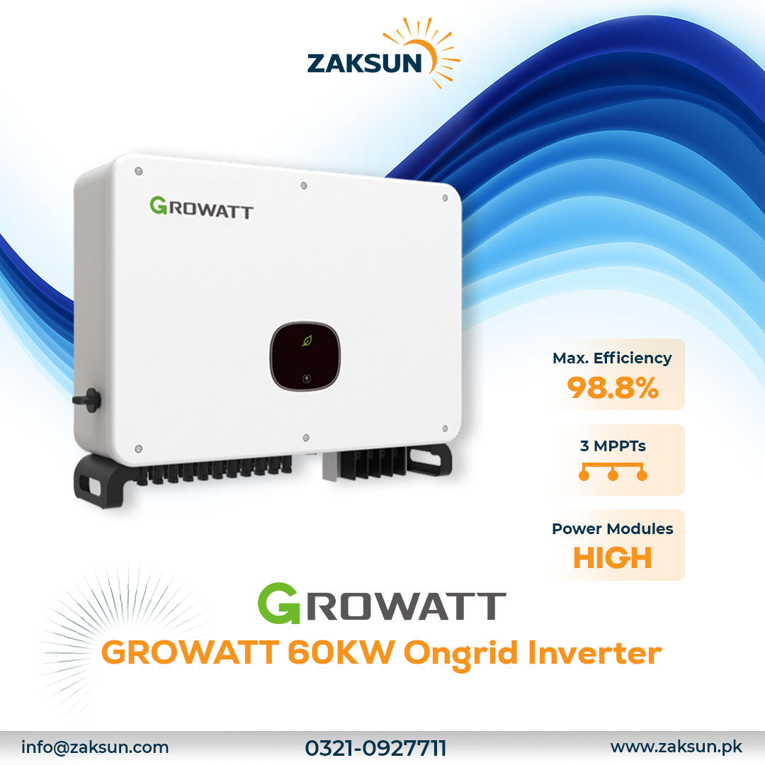 The GROWATT 60KW On Grid Inverter is engineered for high-efficiency solar energy conversion, ideal for large-scale residential and commercial installations. It seamlessly integrates with the grid, optimizing power output while ensuring stable and reliable energy supply. Designed with advanced MPPT technology, it maximizes solar harvest even under varying conditions, enhancing overall system performance. Robust and durable, this inverter supports smart monitoring and easy maintenance, making it a dependable choice for sustainable energy solutions.