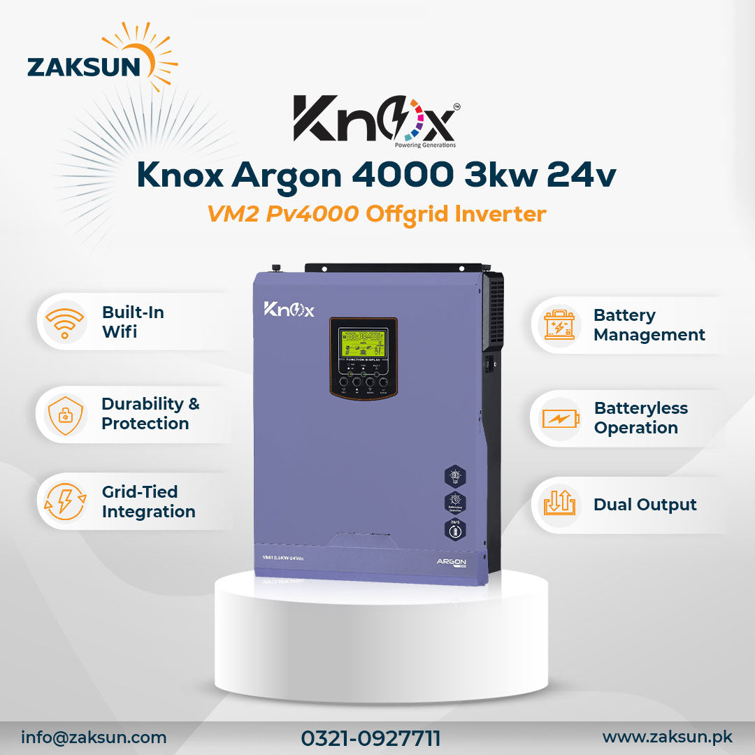 The Knox Argon 4000 is a robust 3kW off-grid inverter designed for 24V systems, ideal for reliable solar power conversion. Featuring advanced VM2 technology, it efficiently manages energy from your PV4000 solar panels, ensuring stable and continuous power supply in remote locations. This inverter supports seamless off-grid operation, making it a dependable choice for sustainable energy solutions where grid access is limited or unavailable. Its durable build and expert engineering guarantee long-term performance and protection for your solar setup.