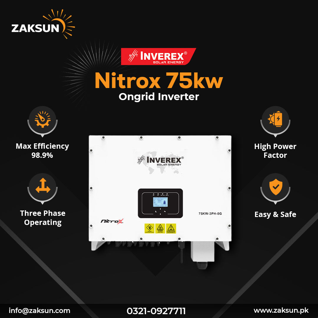 The Nitrox 75Kw On-Grid Inverter is engineered for high-efficiency energy conversion in solar power systems. Designed to seamlessly integrate with the electrical grid, it optimizes power output while ensuring stable and reliable operation. Ideal for commercial and industrial applications, this inverter supports large-scale solar installations, enhancing energy yield and reducing operational costs through advanced technology and robust performance.