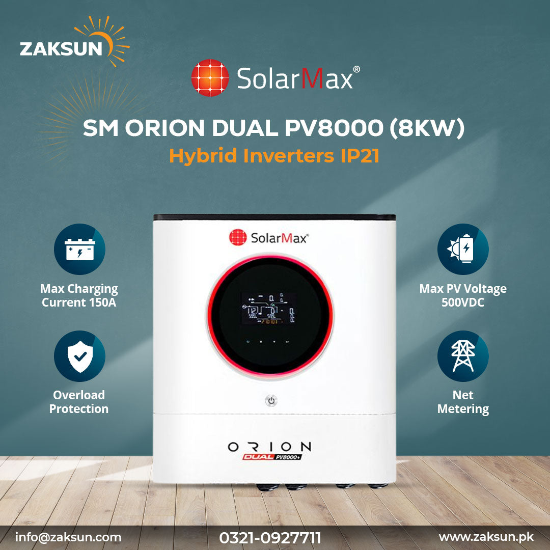 The Solar Max ORION DUAL PV8000 (8KW) Hybrid Inverter offers advanced energy management by seamlessly integrating solar power with grid and battery sources. Designed for high efficiency and reliability, this 8KW inverter supports dual MPPT inputs for optimal solar harvesting. Its hybrid functionality ensures uninterrupted power supply, reduces energy costs, and enhances system flexibility, making it ideal for residential and commercial applications seeking smart, sustainable energy solutions.