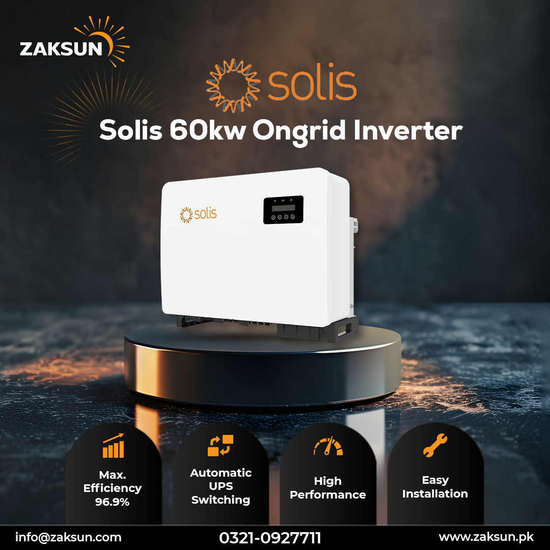 The SOLIS 60KW On Grid Inverter is designed for high-capacity solar power systems, efficiently converting DC energy into stable AC electricity for seamless integration with the grid. Its robust performance ensures optimal energy yield and reliability, making it ideal for commercial and industrial applications. Engineered with advanced technology, this inverter supports grid synchronization and enhances system safety, providing a dependable solution for maximizing solar energy utilization.